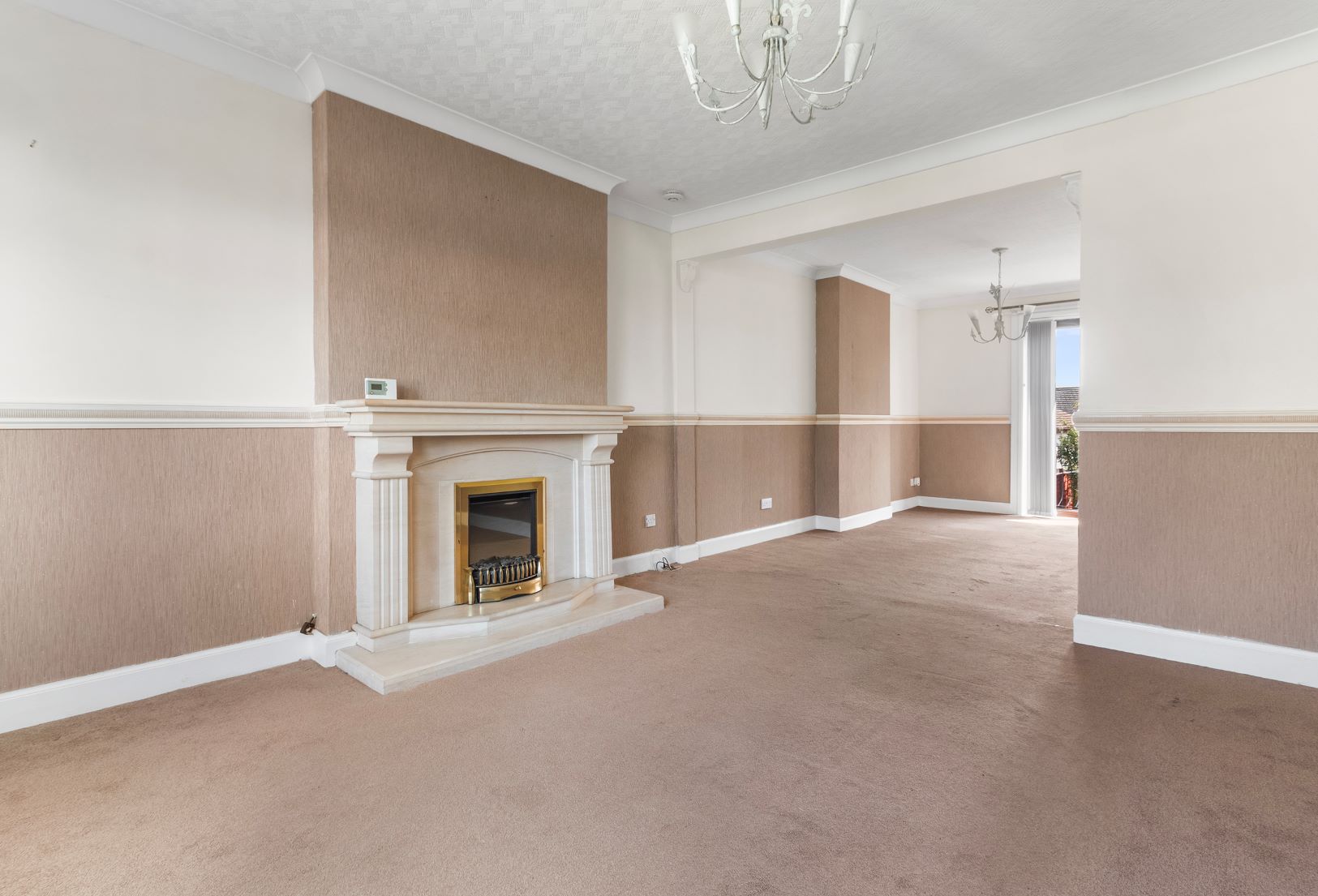 The ground floor comprises a welcoming reception hallway, a large open-plan lounge with feature fireplace and dining area with French doors opening to a patio area, kitchen, family bathroom with white 3-piece suite, and a ground floor bedroom.